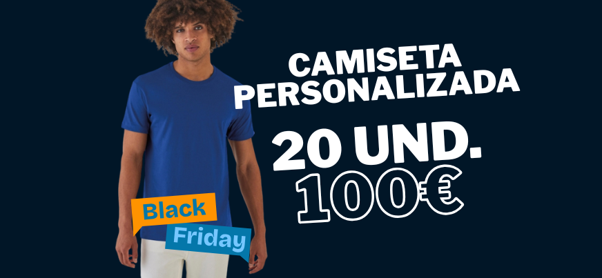 Aprovecha el Black Friday: llévate 20 camisetas personalizadas por solo 100 €, con impresión incluida. Puedes combinar tallas y colores sin coste adicional. Perfectas para empresas, eventos, equipos, promociones o merchandising.