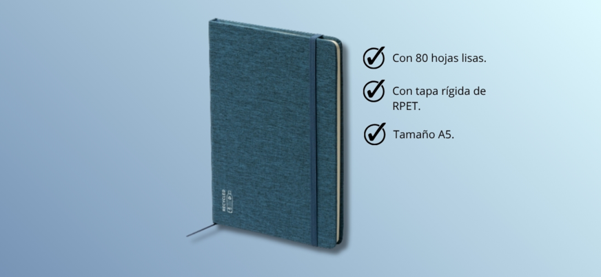 Bloc de notas A5 con tapa rígida fabricada en RPET, banda elástica de cierre, marcapáginas y 80 hojas lisas. Una opción práctica, compacta y respetuosa con el medio ambiente.