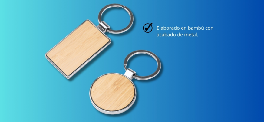 Llavero ecológico KO1147 con diseño en bambú y acabado metálico, disponible en versiones rectangular o redonda. Una opción elegante, sostenible y práctica para llevar las llaves con estilo.