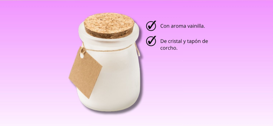 Vela aromática “Surna” VL1313 en recipiente de cristal con tapón de corcho, aroma a vainilla y tarjeta de cartón incluida para personalización. Ideal como obsequio promocional o artículo de decoración.