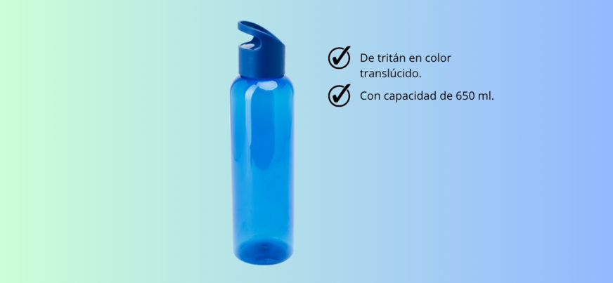 Bidón translúcido de tritán Stamina KINKAN MD4038, con capacidad de 650 ml, asa integrada en la tapa y diseño ligero y resistente. Ideal para deporte, uso diario o como artículo promocional personalizable.